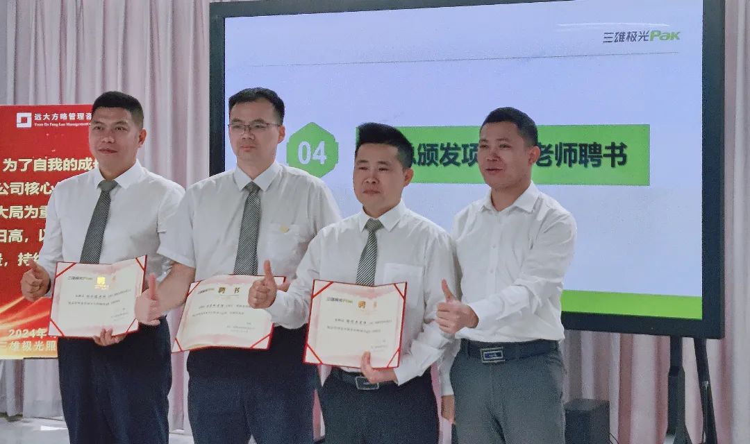 隨后,唐總為遠(yuǎn)大方略項(xiàng)目組老師頒發(fā)聘書,聘請(qǐng)項(xiàng)目組老師為此次項(xiàng)目改善的指導(dǎo)老師,全面推動(dòng)此次項(xiàng)目開展。