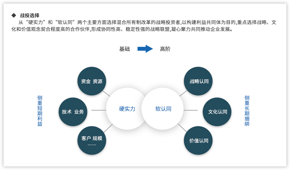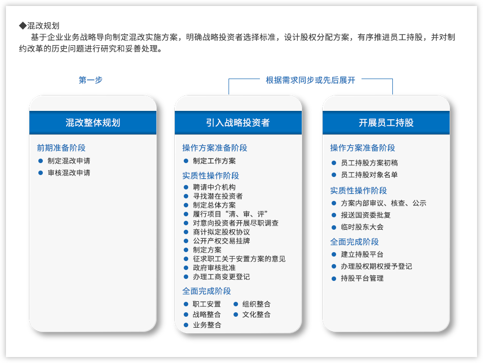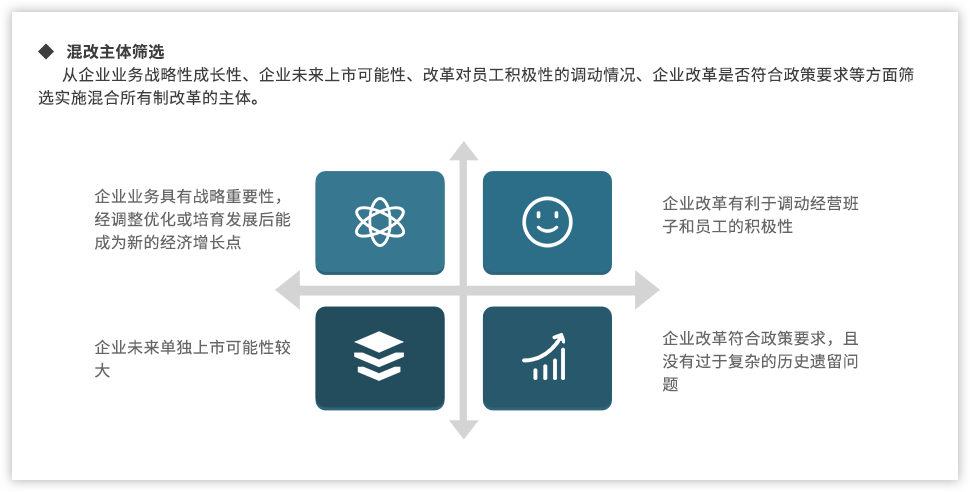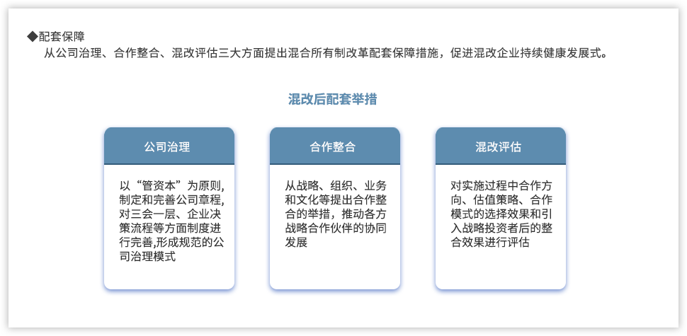 黨的十九大報(bào)告指出:“要深化國有企業(yè)改革,發(fā)展混合所有制經(jīng)濟(jì),培育具有全球競(jìng)爭(zhēng)力的世界一流企業(yè)”;當(dāng)前,隨著國企改革“雙百行動(dòng)”、區(qū)域性國資國企綜合改革試驗(yàn)、“科改示范行動(dòng)”、第三批以及第四批混改試點(diǎn)的實(shí)施,國企改革由點(diǎn)向面梯次鋪開、范圍逐步擴(kuò)大,并呈現(xiàn)明顯加速,國有企業(yè)改革進(jìn)入“深水區(qū)”。追本溯源,國企改革到底怎么改,回到國有企業(yè)改革的初衷我們認(rèn)為,國有企業(yè)改革是以混和所有制為手段,在堅(jiān)持黨的領(lǐng)導(dǎo)下建立現(xiàn)代企業(yè)制度,優(yōu)化管理關(guān)系,創(chuàng)新管理機(jī)制,激發(fā)員工活力,從而最終實(shí)現(xiàn)國有企業(yè)的持續(xù)發(fā)展?;旄穆鋵?shí)到具體實(shí)踐中,便處處是難點(diǎn)。遠(yuǎn)大方略認(rèn)為,混改的重點(diǎn)已經(jīng)從以“政策研究+方案制定”為主轉(zhuǎn)變到以化解落地過程中的實(shí)際痛點(diǎn)為主,從剖析“為什么混、和誰混、怎么混”轉(zhuǎn)變?yōu)槁鋵?shí)治理結(jié)構(gòu)、戰(zhàn)略協(xié)同以及激勵(lì)機(jī)制等深層次問題。