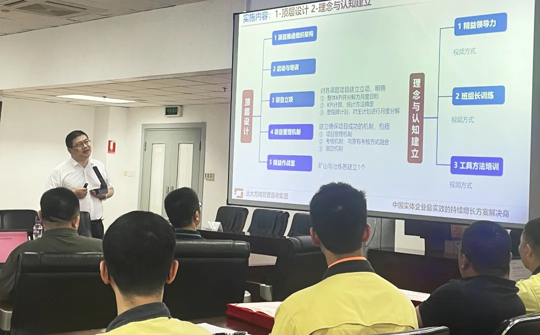啟動(dòng)會(huì)上,項(xiàng)目組老師首先向中冶瑞木對(duì)遠(yuǎn)大方略的信任表示感謝,老師介紹了項(xiàng)目的頂層設(shè)計(jì),先對(duì)整體框架和關(guān)鍵要素進(jìn)行明確和規(guī)劃,主要包括項(xiàng)目推進(jìn)組織架構(gòu),啟動(dòng)與培訓(xùn),項(xiàng)目立項(xiàng)、項(xiàng)目管理機(jī)制以及精益作戰(zhàn)室。項(xiàng)目能否成功落地除了框架的建立,理念與認(rèn)知的建立也是十分重要,要對(duì)大家進(jìn)行相關(guān)培訓(xùn),包括精益領(lǐng)導(dǎo)力、班組長(zhǎng)訓(xùn)練以及工具方法培訓(xùn),提升認(rèn)知,掌握理論才能更好地落地實(shí)踐。