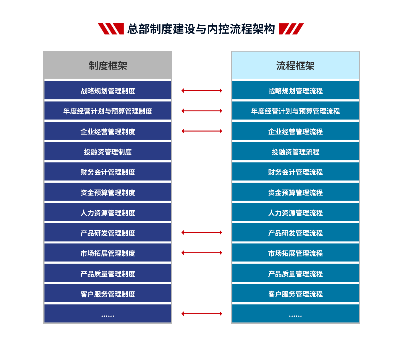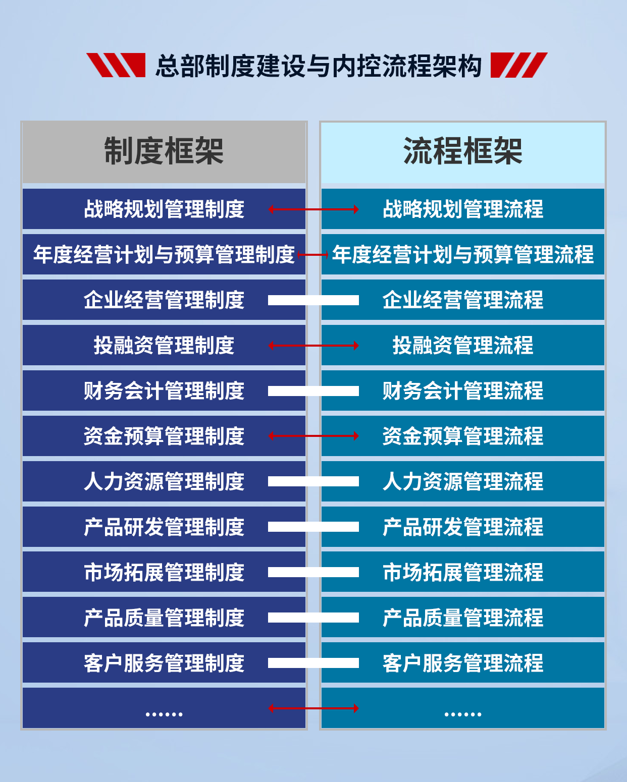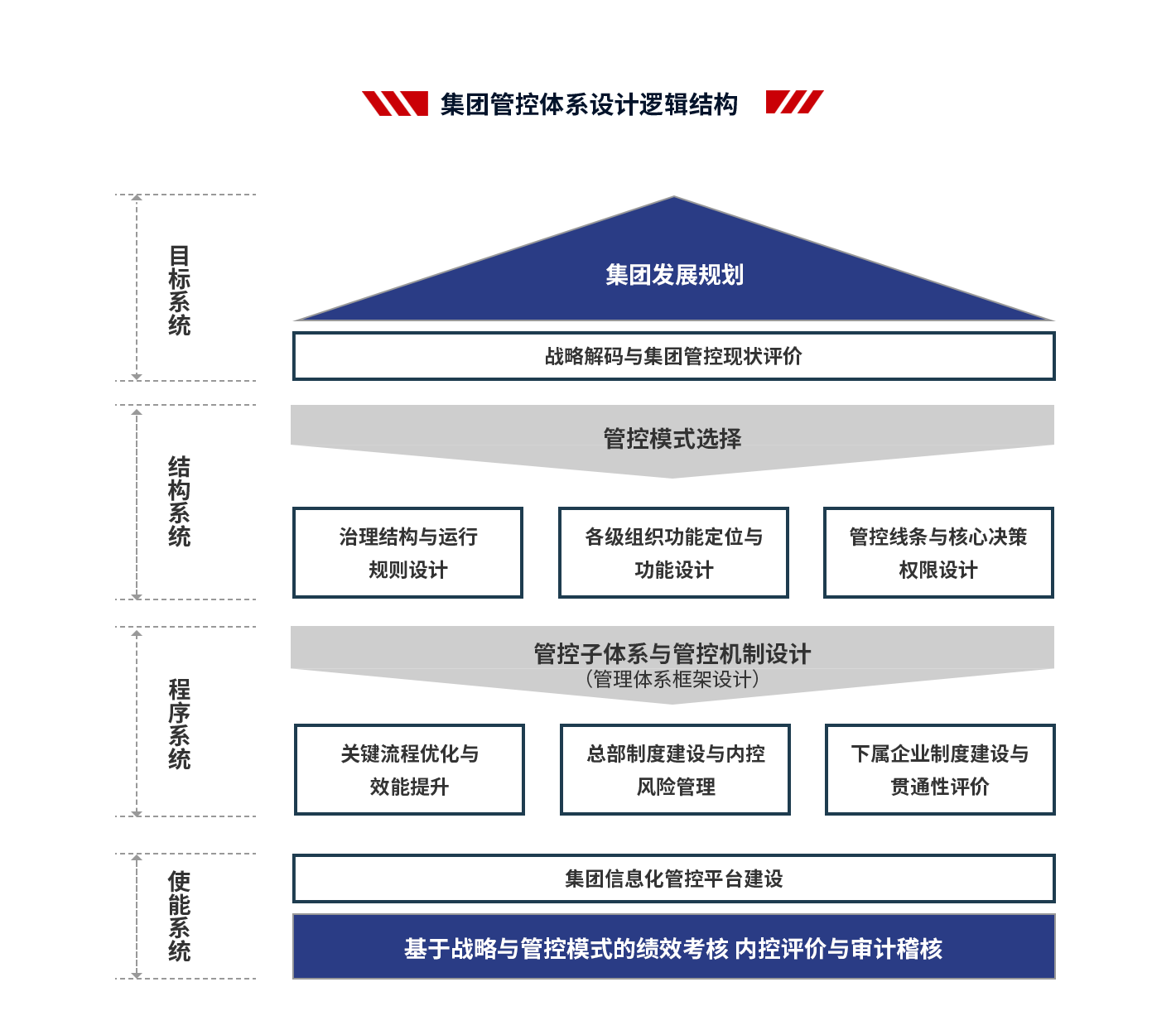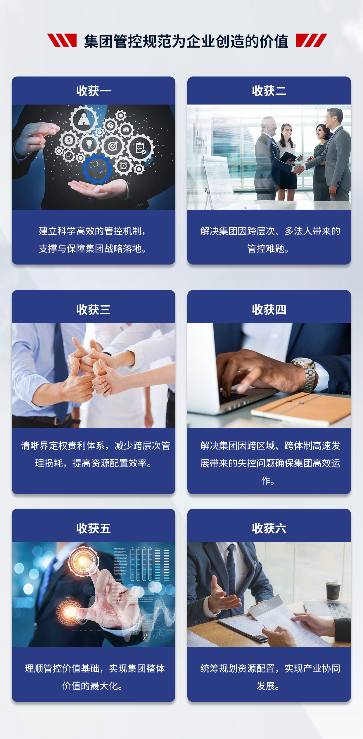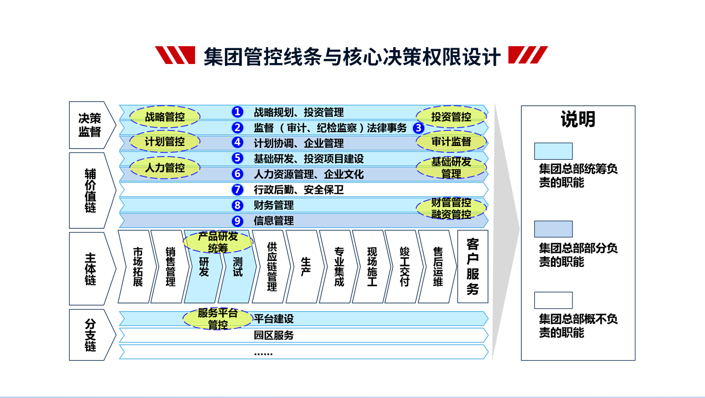 4、項(xiàng)目成果:支撐集團(tuán)戰(zhàn)略落地,提高集團(tuán)整體的運(yùn)營(yíng)效率;減少因跨層次管理帶來(lái)的損耗,提高集團(tuán)內(nèi)部資源配置效率;建立一套廣譜、可復(fù)制的管控模式;解決集團(tuán)因跨區(qū)域、跨體制、高速發(fā)展帶來(lái)的失控問(wèn)題,確保集團(tuán)高效運(yùn)作;理順管控價(jià)值基礎(chǔ),實(shí)現(xiàn)集團(tuán)整體價(jià)值的最大化;打造強(qiáng)勢(shì)總部,解決集團(tuán)總部空心化、文職化等問(wèn)題。